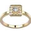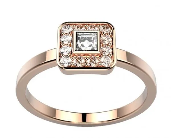 Pierre de centre : 0,10 ct (Ø 3.0 mm ) qualité F / VS taille Princesse, accompagnée d’un entourage de 12 pierres 0.01 ct ( Ø 1.3 mm) F / VS taille Brillant – serti 4 griffes – Poids total diamant : 0.22 ct